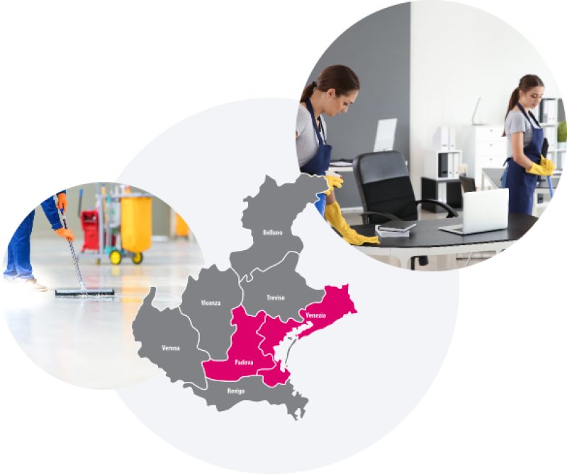 I nostri servizi di pulizie sono attivi in tutto il Veneto, con particolare copertura delle province di Padova e Venezia. Interveniamo in uffici, condomini, capannoni e strutture ricettive, garantendo interventi rapidi e professionali.